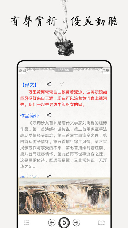 1、准确的拼音、全面的注释、甜美的译文、易懂的启示、有趣的故事、水墨风图画、还有实用/易用的跟读背诵学习功能。