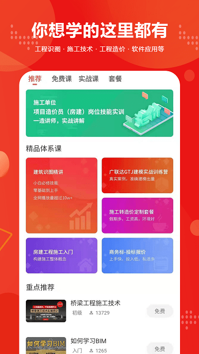 2.善课程体系:涵盖施工、招投标、资料、造价、BIM方向课程。