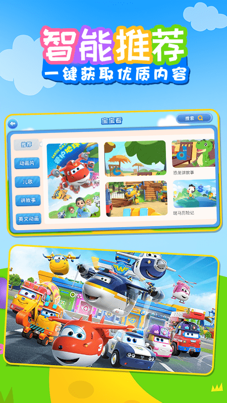 5.视频播放界面大屏大按钮,简单易用,1岁宝宝即可轻松自主选择内容,给予家长更多自我空间。内容分龄且支持场景推荐,包括叫早、哄睡、运动等多模式需求。