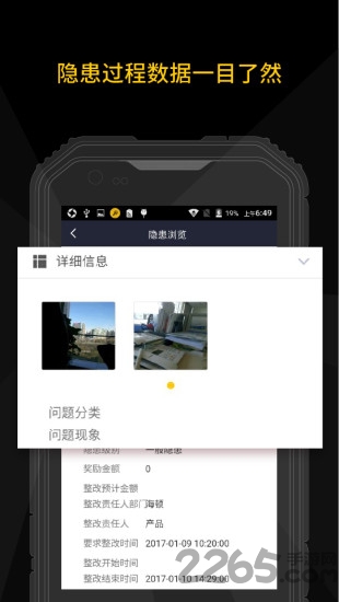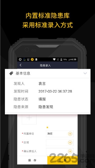 隐患发现:内置标准隐患库、为用户提供标准录入方式,隐患描述更准确,发现隐患时随时用手机记录隐患,拍照留证,一键上报隐患