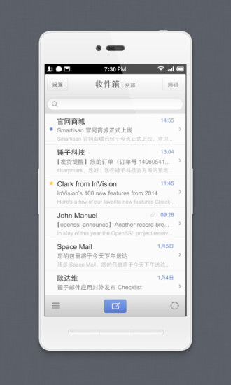 聚合全部邮箱账户,智能显示收件箱、星标和未读等邮件。在多个邮箱账户之间轻松切换,方便快捷;