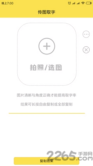 本软件解决了办公或者生活中遇到图片中有文字想把文字复制出来的问题,使用方法为首先点击上传图片,将需要提取文字的图片上传,然后等待3秒左右就会提取出图片中的文字,我们可以复制文字到自己想要的地方,支持拍照和相册选图,非常的方便与快捷,快来试一试吧!