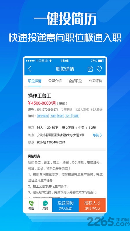 可以立即拨打HR电话或投递简历,还可以在线导航到用工单位,完全免费哦。