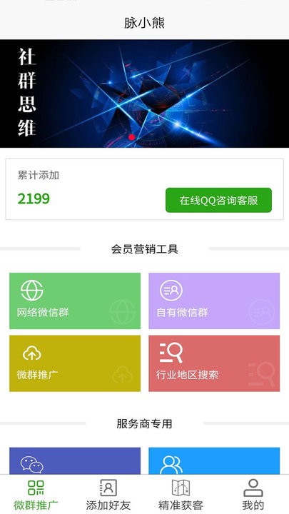 脉小熊为客户提供社群营销及推广获客的服务需求,给你所需,用你所用。脉小熊APP从多个维度、通过大数据分析,帮助具有共同使命和愿景的群体,实现社群人脉共享以及资源智能整合。