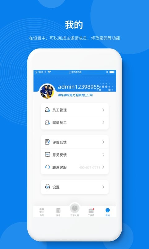 针对不用类型的用户,显示与其相关的待办信息;工具箱,工具箱功能为不同了诶性用户提供工具支持;我的,在设置中,可以完成主邀请成员,修改密码等功能。