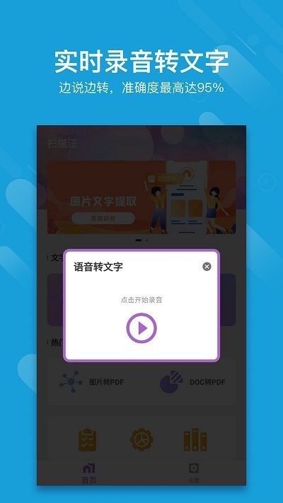 扫描汪是一个智能扫描工具,帮助用户扫描图片、文件等,快速识别扫描内容,并生成相应的pdf文档,一键分享给好友进行查看;对准需要的文字内容进行拍照扫描,自动生成相应的选择框,可以拖动选择框调节大小,也可以进行左转或右转操作;精准识别并生成电子内容,可以进行编辑和修改,并设置导出的模式,直接复制使用更加简单;也提供了实时录音转文字的功能,边说边转,保障用户便捷的进行记录,还可以翻译成需要的语言;该软件也为用户提供了其他工具,比如有风格识别、车型识别、垃圾识别、格式转换