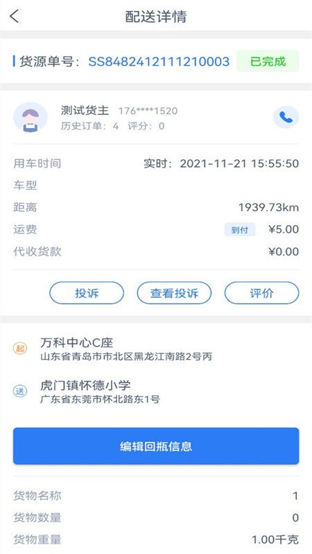3.司机和用户都提供了在线接单功能,可以查看货源详情,快速在线查找货物进行运输