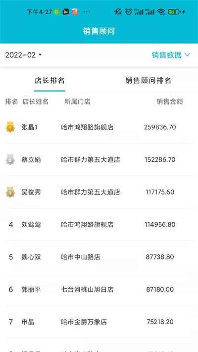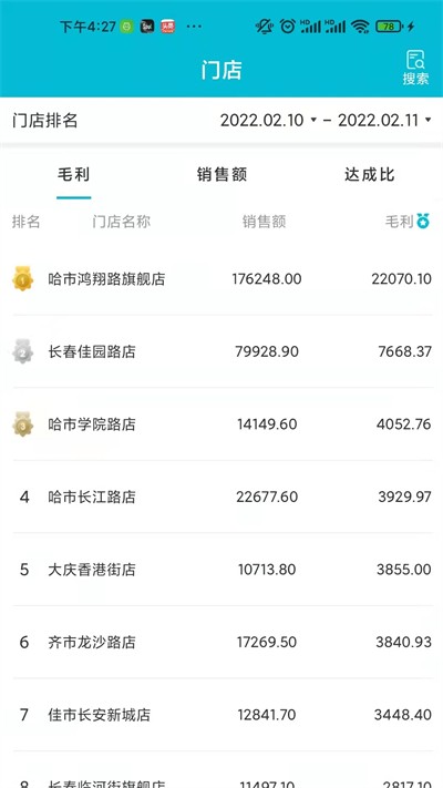晟美助手是为本公司内部员工服务的销售业绩,毛利,销售额,达成比,以及各个门店等各项数据排名