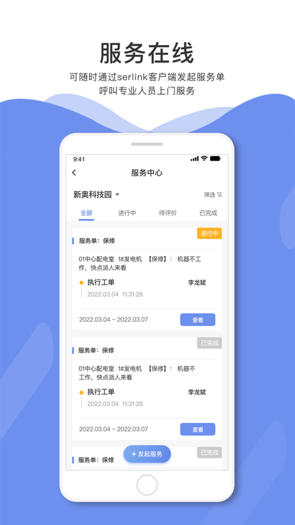 通过智能运维服务平台与移动APP联动,在由专业团队提供运行、检修、抢修、实验等工作同时,还可随时通过serlink客户端发起服务单,呼叫专业人员上门服务;线上即可查看进度,并对服务进行评价。